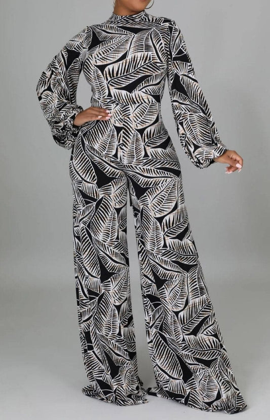 Leaf Print Wide Leg Jumpsuit with Sash