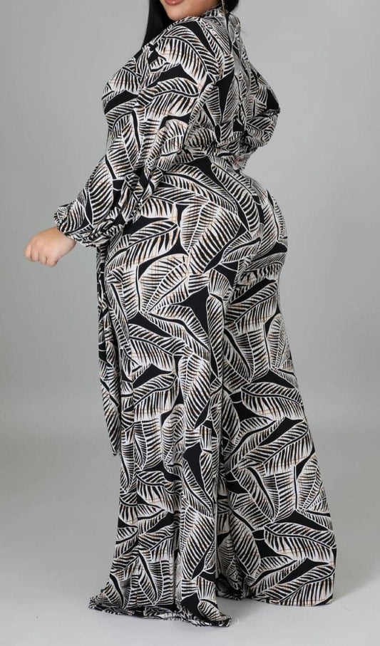 Leaf Print Wide Leg Jumpsuit with Sash (Curvy)