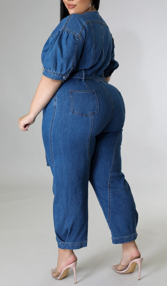 V-Neck Dark Denim Jumpsuit (Curvy)