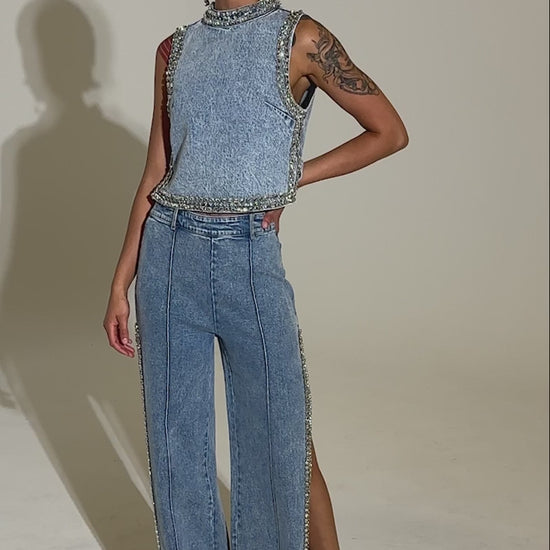 Make a bold statement with the Popping Out Rhinestone Denim Blouse. This sleeveless high-neck crop top is crafted from medium-wash denim and features a mock neckline with dual button closures at the back and rhinestone-encrusted edges along the neck, armholes, and hemline. Complete with an open back slit and a relaxed, cropped silhouette. Pair with the coordinating AKIRA Label Popping Out Rhinestone Denim Pant, kitten heels, and chunky jewelry for a finished look.