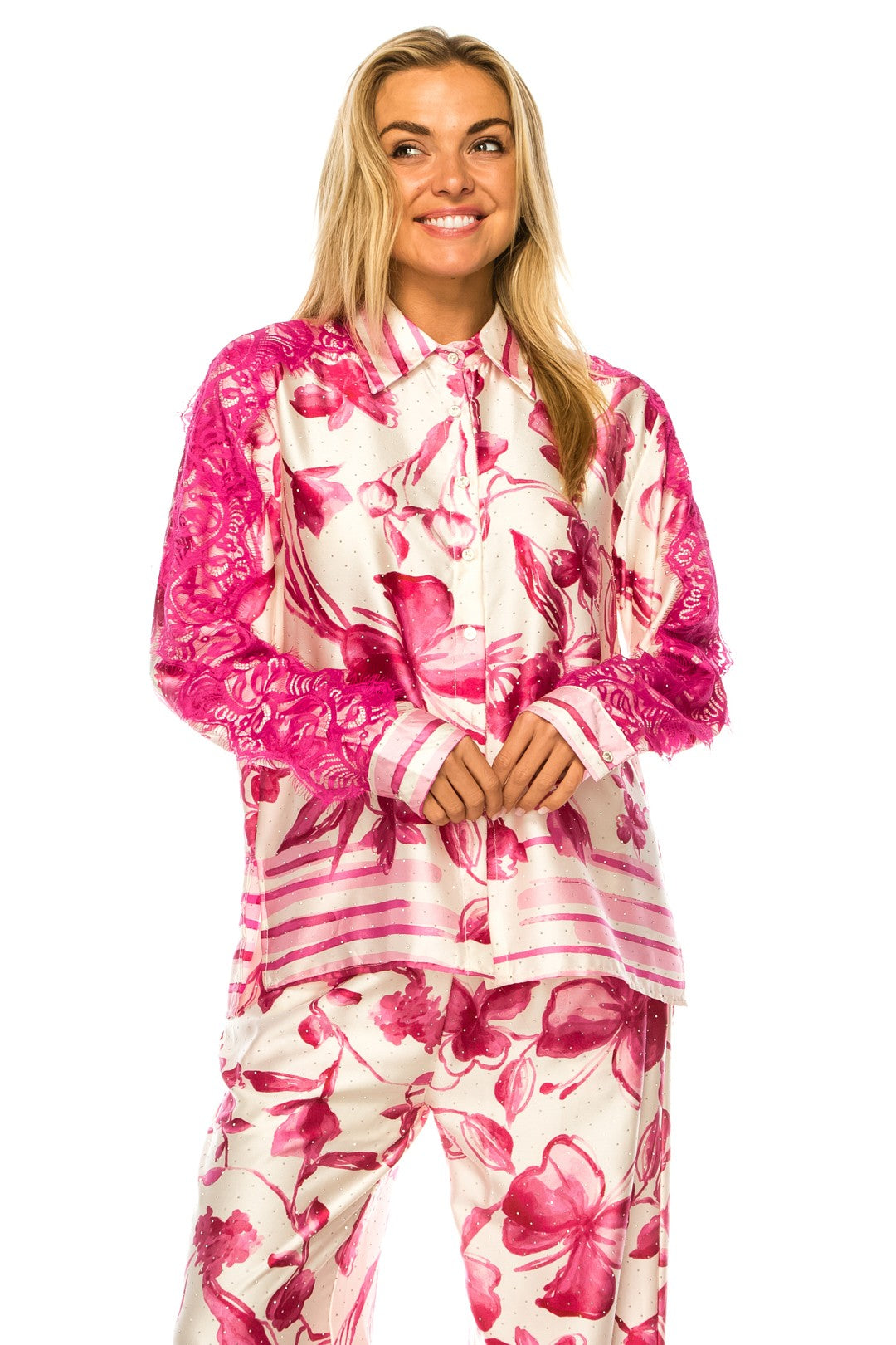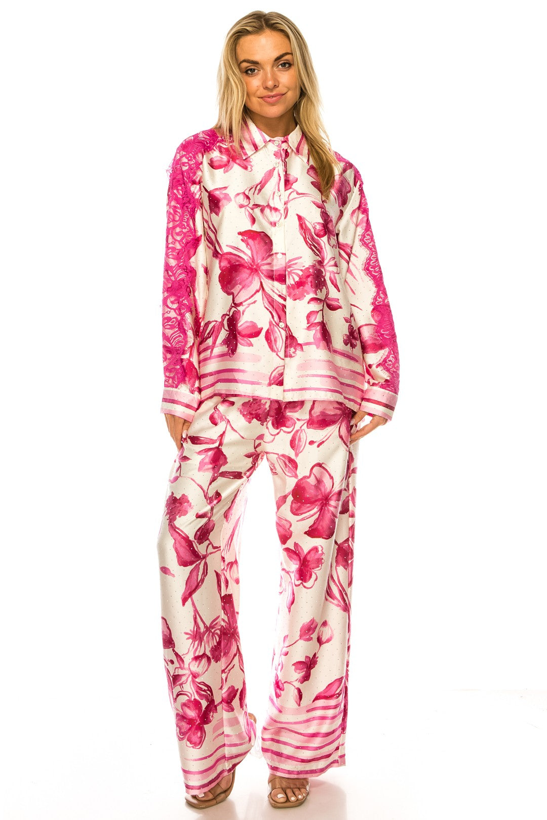 This printed blouse set features a chic blouse adorned with a captivating print, complemented by matching wide-leg pants for a polished look. Delicate lace detailing along the sides adds an elegant touch, and rhinestones sprinkled throughout enhancing both style and sophistication. Perfect for occasions that demand refined comfort and standout appeal.