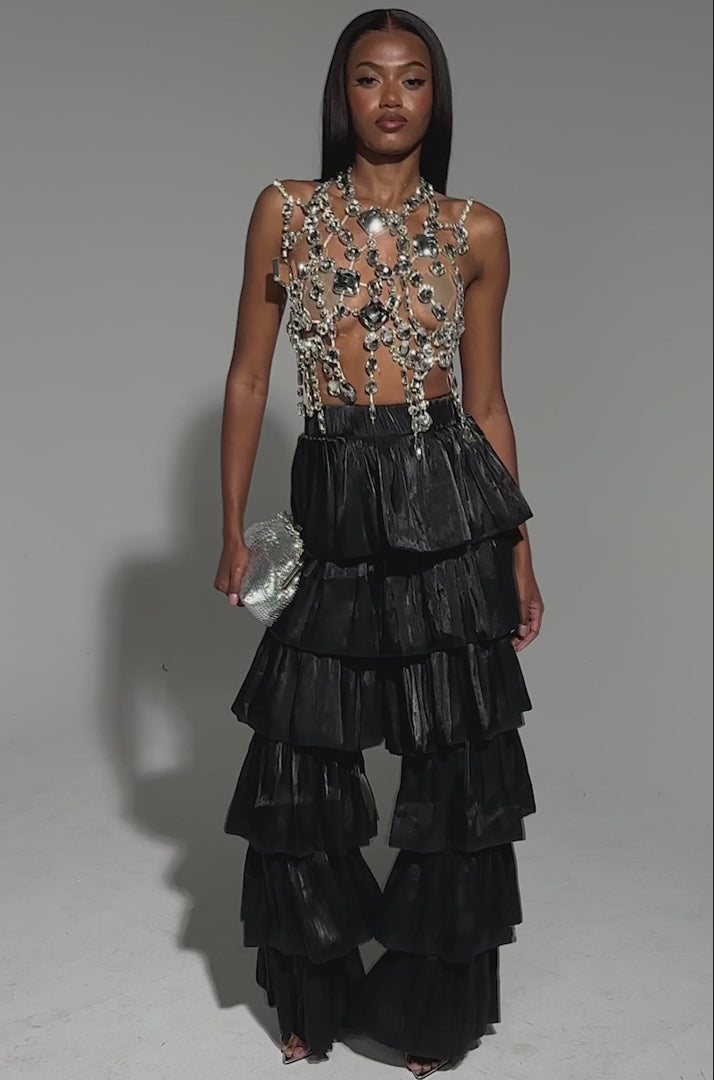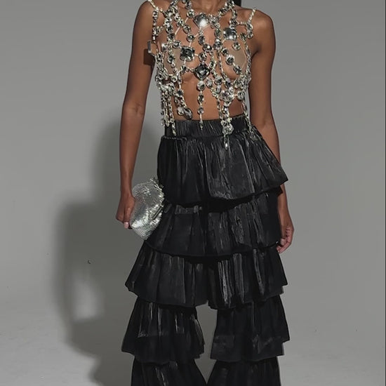Live the life of a show girl in this very Unique Rhinestone Bralette, a showstopping piece made entirely of oversized crystal-cut rhinestones. Designed with layered clusters of square, teardrop, and round stones, it creates a bold, sculptural look that sparkles from every angle. Cascading rhinestone strands add movement and drama, giving it a chandelier-like effect. Complete with adjustable hook-and-eye closures at the neck and back straps.